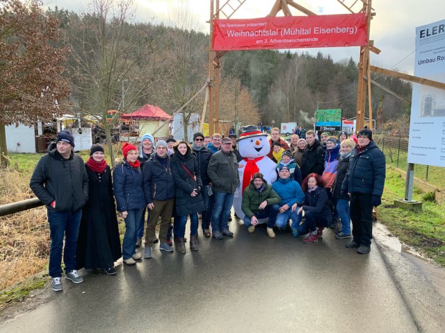 gleich zwei Vereine Dobitschens gemeinsam unterwegs. Gemeinsam stiegen ca. 40 Mitglieder des Faschingsclubs und des Feuerwehrvereins gegen Mittag in den voll besetzten Bus und ließen sich von Dobitschen an den Kursdorfer Eingang des Mühltals chauffieren. Von da an ging es zu Fuß (auch wenn Mancher aufgrund von Selbstauflösung zuvor noch neue Fußbekleidung benötigte) auf die unterhaltsame ca. sieben Kilometer lange Strecke entlang der acht Mühlen und unzähligen Zwischenstopps in Form von weihnachtsmarktähnlichen Ständen.